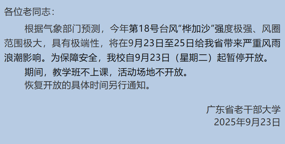 9月23日,广东省老干部大学发布《关于暂停教学和活动的通知》,明确为保障安全,学校自23日(星期二)起暂停开放。其间,教学班不上课,活动场地不开放。恢复开放的具体时间另行通知。