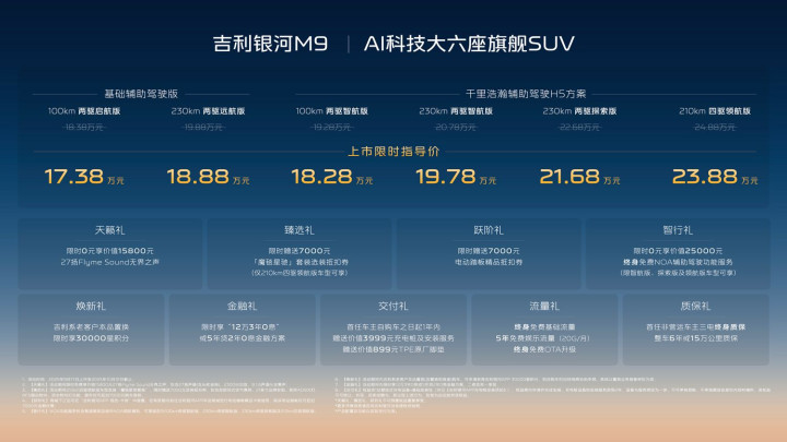相比之下,原本我们认为吉利略有品牌溢价,银河M9会比预期价格更高,但预售价公布后,就已经足够吸引我们的同时,上市售价进一步让利消费者,最终以17.38万元的起售方式,大大出乎了我们的预料,也让所有的竞争对手倍感压力。